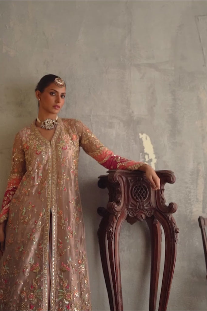 This absolutely stunning shirt is crafted from exclusively woven rose gold lame silk. The rich canvas is intricately hand worked in zardozi and infused with gotta and poppy resham to give traditional festive feels. Pair it with our crushed silk lengha with heavily worked borders and shine on at your loved ones dholkis or mehndi!