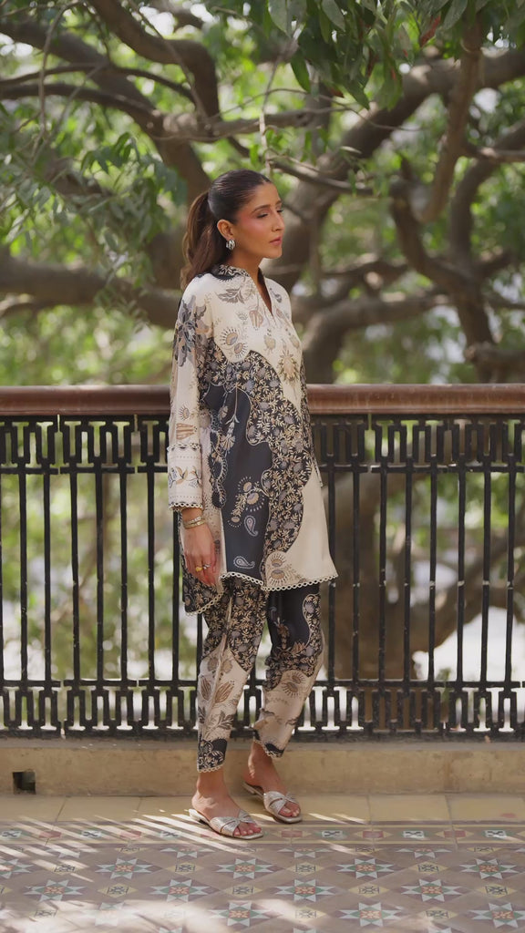 The striking contrast of cream against deep ebony defines the Onyx Jewel set. Featuring a bold and densely arranged botanical pattern in grey and beige tones, grounds the piece in traditional artistry. The clean neckline and long sleeves keep the focus on the richly detailed print. It is paired with an equally scintillating tapered shalwar for a look that fuses modern elegance with flawless colour play!