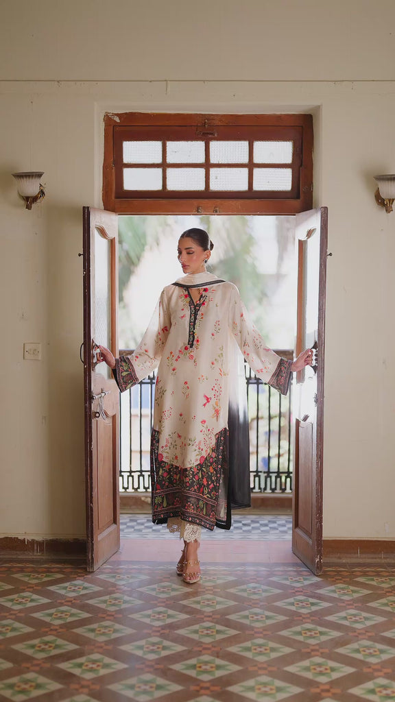 A softly tailored ensemble, Cloudy Zola is elevated with fresh verdant accents and a delicate floral print along the ivory and black canvas. The relaxed raw silk shirt is enhanced with a 3D floral embroideries and hand made buttons along the neckline. It is paired with an ivory pant and a complimenting medium silk dupatta for an effortless blend of craft and modern polish.