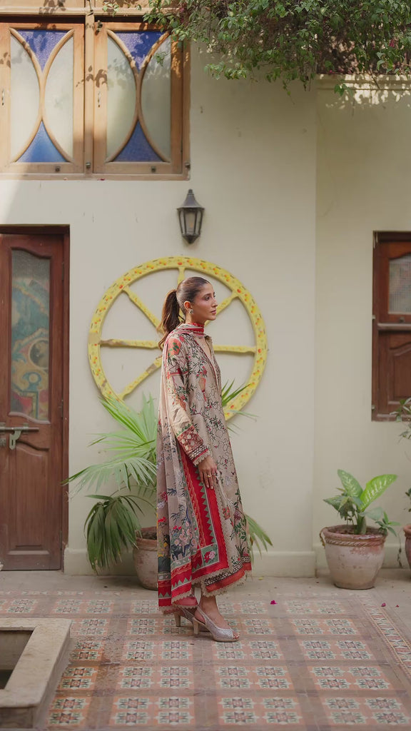 Exude timeless elegance in this traditional angarkha silhouette, Leeza. Printed with stunning chinoserie imagery and detailed with cutwork embroidery along the shirt front, Leeza is a sure-shot head turner. Pair it with a diaphanous silk dupatta that flows in a dreamy blend of rich colours and is finished with lace details.