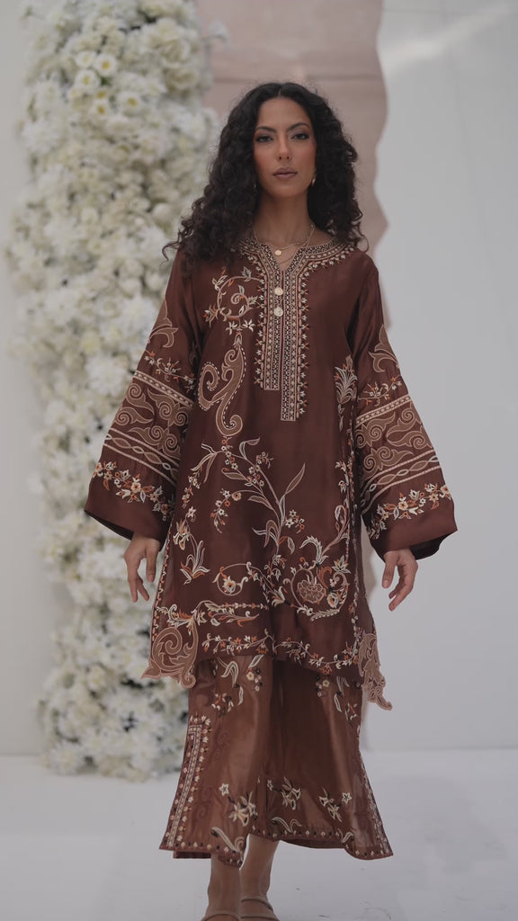 This chic mocha brown pure sheesha silk ensemble features a relaxed mid-length shirt defined by exquisite tonal & contrasting resham embroidery and enhanced by appliques. Scalloped applique details trace the daman with fluid grace. The shirt is paired with contrasting tonal culottes, subtly accented with resham embroidery along the pant and slits. A portrait of quiet, understated elegance, Mehrnaz is sure to make heads turn this season!