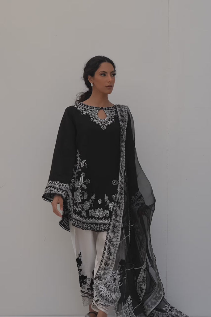A monochrome moment you wont forget - bold, elegant, and effortlessly statement-making. This black silk karandi shirt features striking ivory appliques, complimented by ivory resham embroidery and sequin detail. The look is further enhanced with a meticulously crafted ivory shalwar with velvet appliques and intricate cutwork. Pair it with a pure organza dupatta rich with embroidered borders along all 4 sides.
