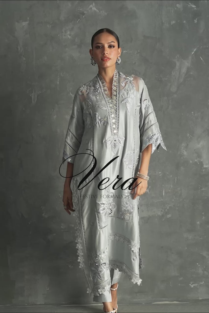 This is 'eclat' - an outfit that defines grace and opulence all at once! There is a quiet harmony in balance , a beautiful symphony at play in this stunning A-line canvas. The intricate amalgamation of embroidered blooms, cutwork, zardozi & gotta speaks of immaculate craftsmanship that sparkles thru on this gray shirt. Add royalty to this artistry with a well-defined lace encrusted neckline dotted with kamdaani! A subtle contrasting meysuri dupatta with pleat details adds a modern touch to this showstopping outfit!