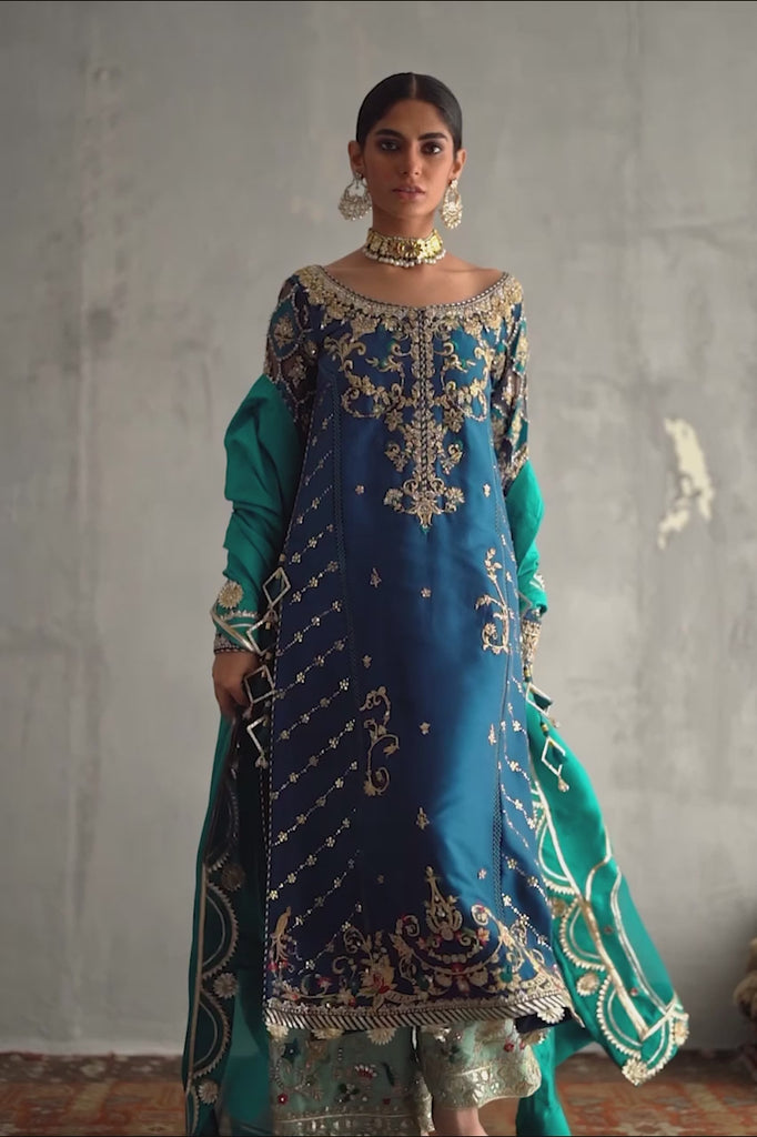 Elevate your wardrobe with our regal outfit where colour is at play in the most beauitful way. Featuring a straight long shirt crafted from luxurious raw silk, it is crafted in ganga jamni zardozi with panels worked artfully in kaamdani. Net applique in the sleeves brings in a unique dimension to the outfit. Pair it with our handworked culottes and a stunning emerald green organza dupatta to make heads turn!