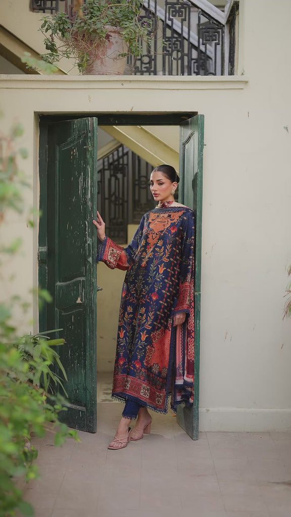 A striking Navy blue hued A-line silk kurta, Malina is adorned with a vibrant botanical and avian print in crimson and tangerine. It is designed with an applique embroidered neckline with mirror details and finished with lace details on sleeves and daaman. A cascading printed silk dupatta featuring colour blocked prints elevates the shirt and is finished with lace detailing on all four sides.